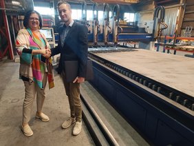Caption 1: Christine Wagner, Managing Director of Alfred Wagner Stahl Technik & Zuschnitt GmbH (right) and Gerhard Wimmer, Head of Messer Cutting Systems Austria, next to the new ELEMENT, © Wagner Stahl